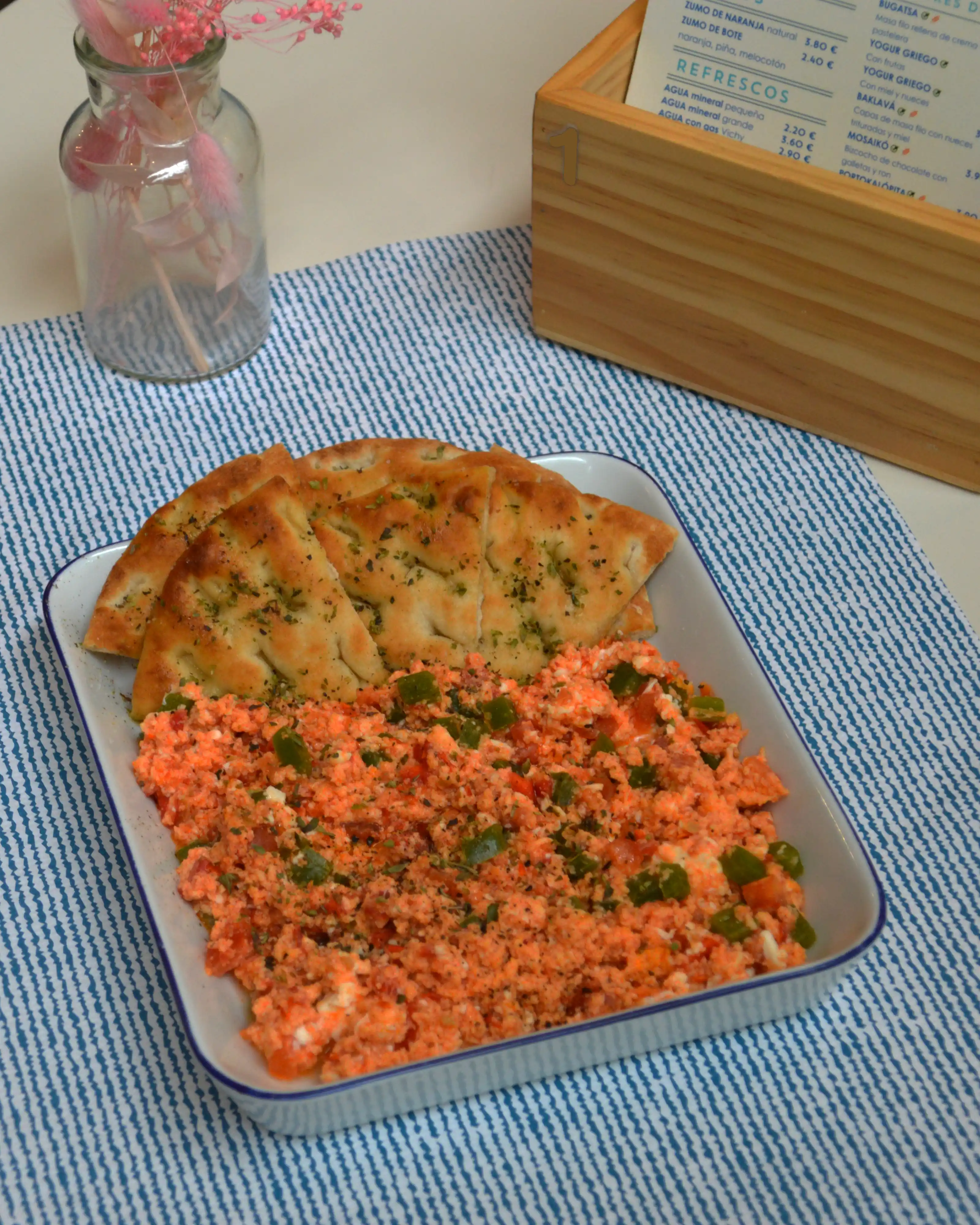 Huevos batidos con tomate, pimiento verde y feta Servido con pan pita