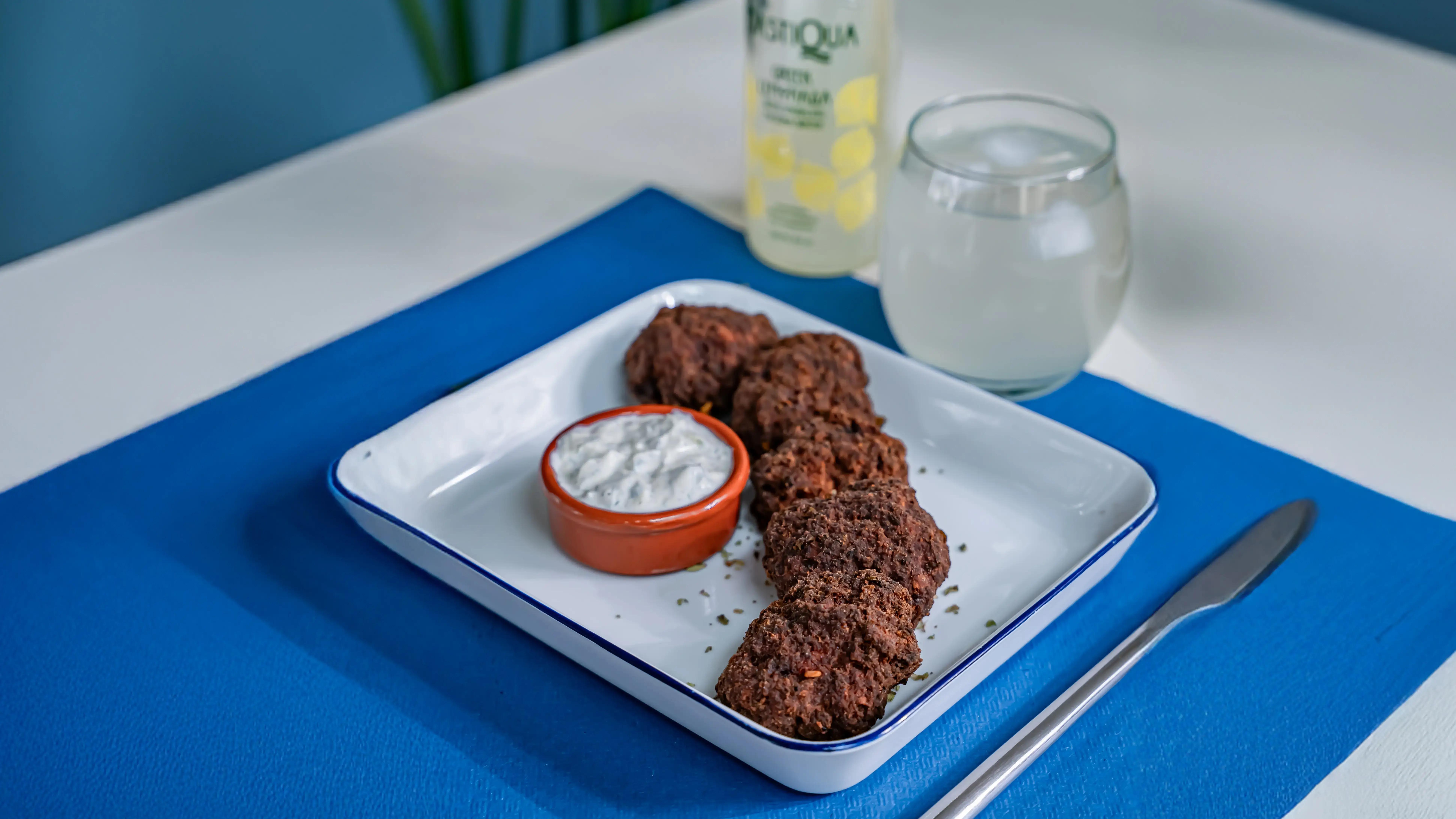 Albóndigas griegas hechas con carne picada, hierbas y especias. Servidas con salsa tzatziki.